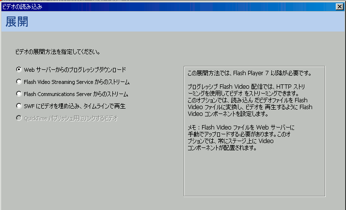- ビデオの展開方法は「Webサーバーからのプログレッシブダウンロード」にする。