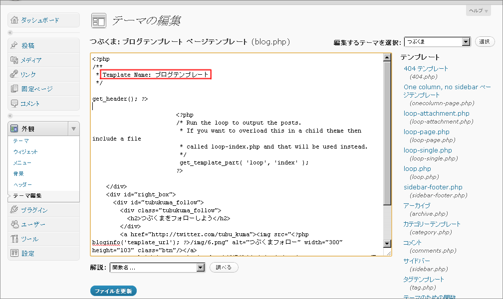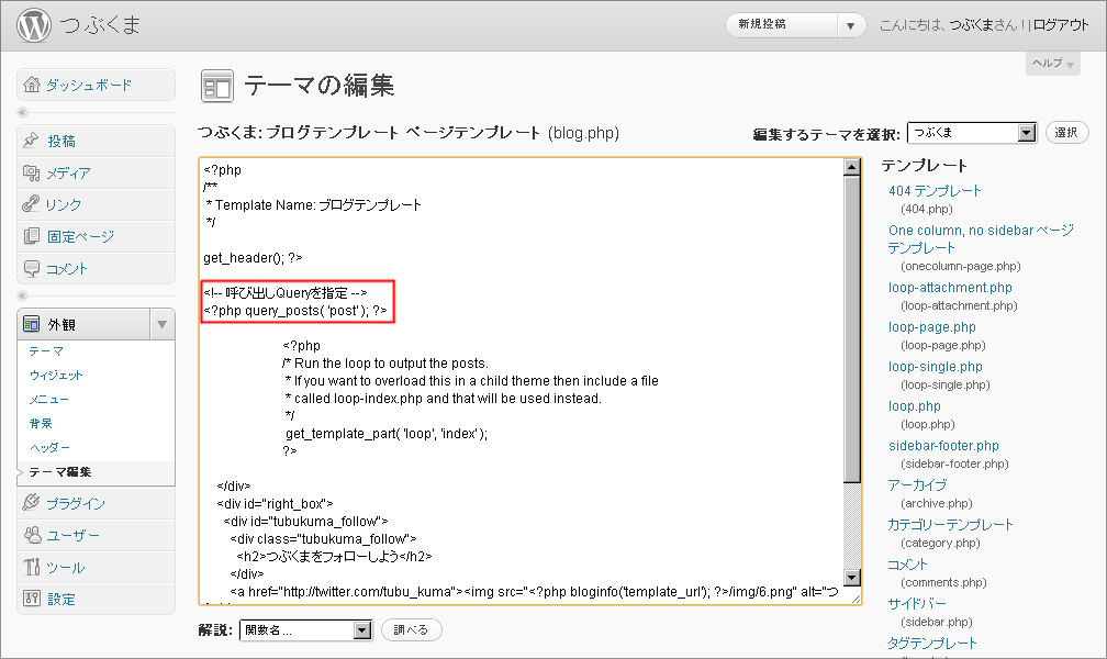 - ダッシュボードにアクセスし「blog.php」をつぶくまのレイアウトに併せて編集します。