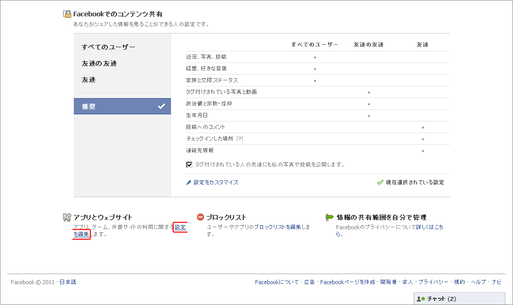 - 「あなたが利用しているアプリ」の「設定を編集」をクリック。