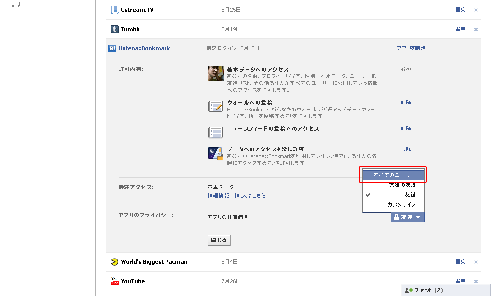 「友達」から「すべてのユーザー」に変更。(この地点で設定完了)