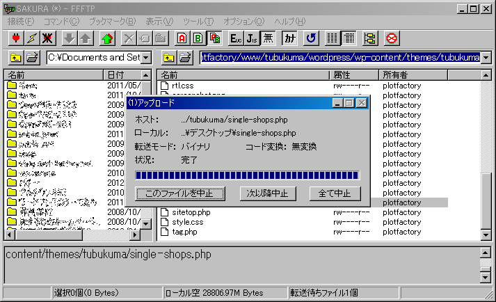 - まずはサーバーから該当のテーマフォルダ内の「single.php」をダウンロードして「single-shop.php」(カスタム投稿タイプが「shops」の場合)に改名、同じ場所にアップする。