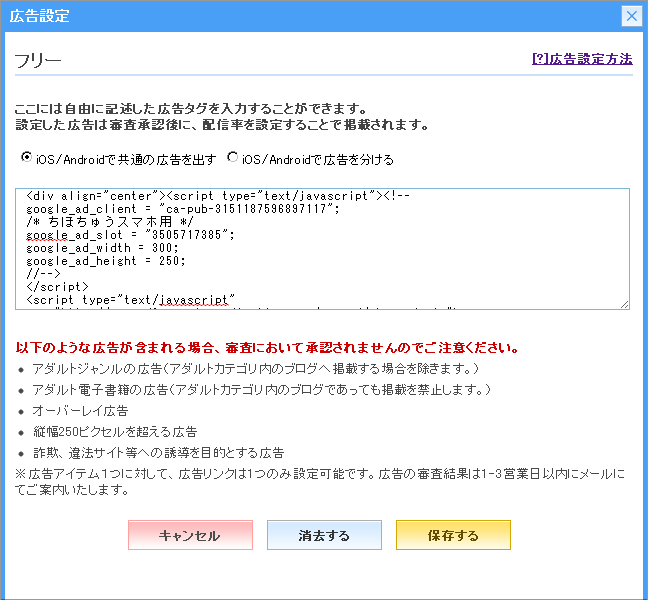広告サイズは300×250(レクタングル中)がベストだと思います。 - できたソースをlivedoor blogのスマホ広告に適応させます。
