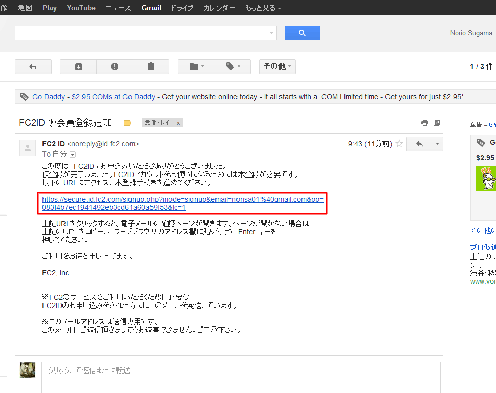 - 登録時のメールアドレスにメールが送信されるので確認してそこに書かれているURLをクリック。