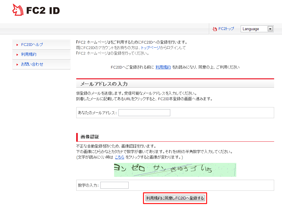 既にFC2アカウントを持っている方は「ログイン」をクリックしてログインし、「6.」へ - メールアドレスと画像に書かれている数字を入力して「利用規約に同意しFC2IDへ登録する」をクリック。