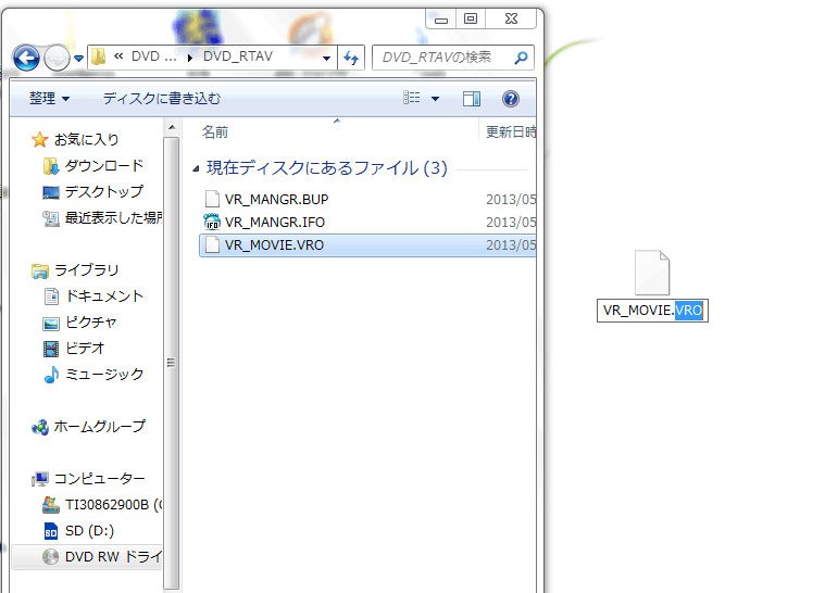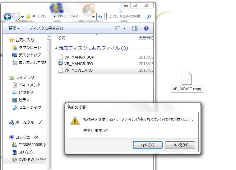 つまり、VROファイルをパソコンで再生させるには拡張子をmpgに変えてあげればOKだということになります。
