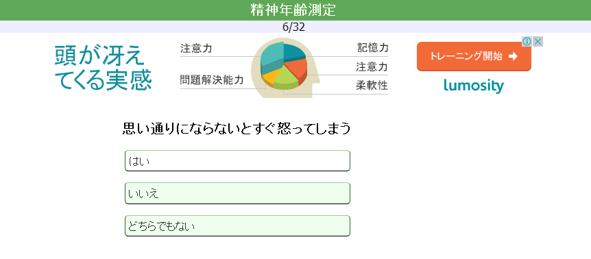 - 質問は全部で32問。全て答え終わると精神年齢を表示してくれます。