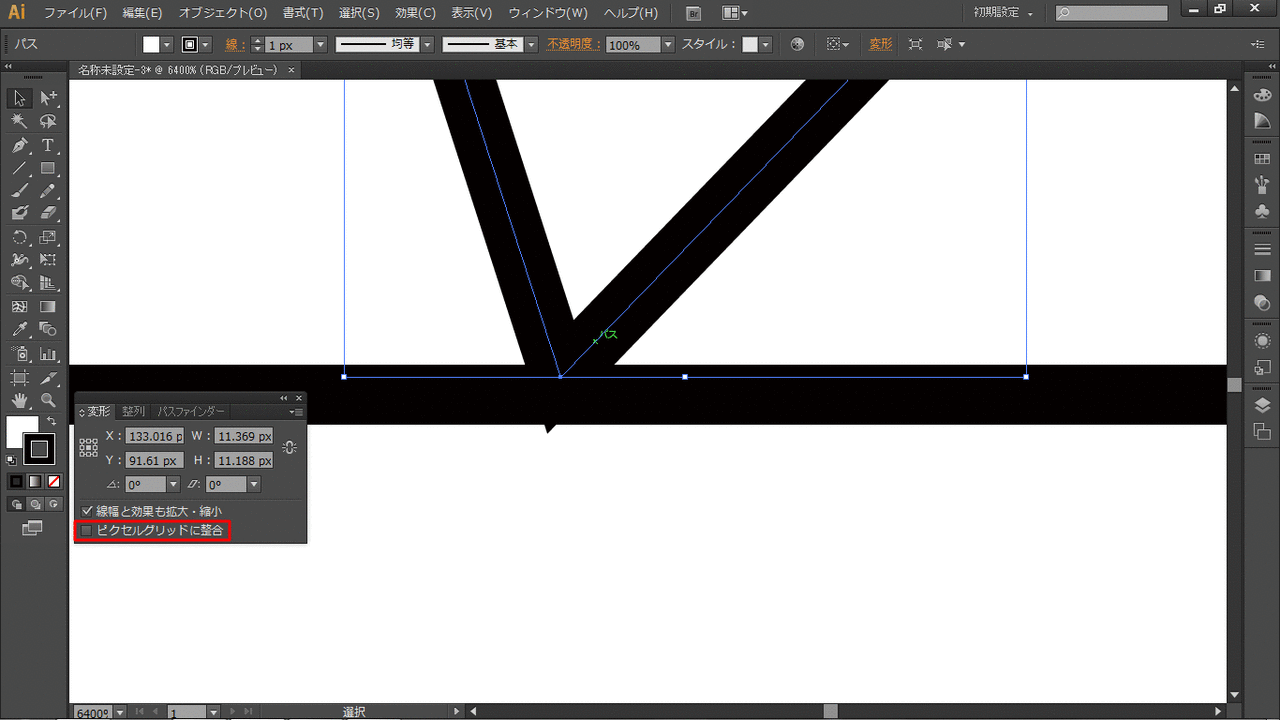 以前(CS5?)は「環境設定」、もっと以前(CS4)は「表示」メニューから「ピクセルにスナップ」を選ぶことで可能となっていたこの機能がCS6から「変形」パネルのチェック項目になっていたという。。