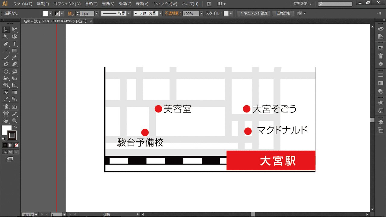 Web用に作ったマップを印刷物でも流用しようと印刷物にコピー&ペーストして拡大したら枠罫線やJR線等が変な表示になったしまった。