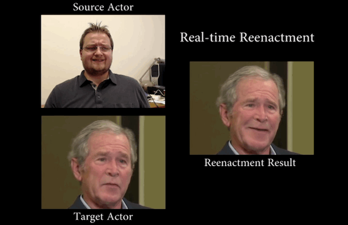 誰かが話をしているYouTubeビデオをダウンロードする。ここでは、George W. Bushにしよう。標準のRGB Webカメラを使って、別の人が大げさにYouTubeの本人とは違うことを言ってるビデオを撮る。この二つのビデオをFace2Faceのシステムに投入する。そうすると、本物のGeorge W. Bushの顔と思われるビデオが、第二のビデオとほぼ完全にシンクして、後者がビデオで撮ったスピーチを喋っている。口の動きだけでなく、口の中まで同じだ。