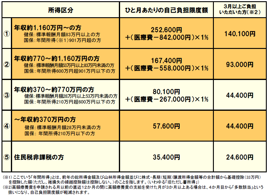 高額療養費制度の自己負担限度額。 出典:厚生労働省資料