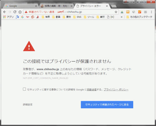 1月31日10:00頃、1月中までのSSL証明書の期限が切れ、当ブログにhttpsでアクセスしたときのGoogle Chromeの表示が以下のようになってしまいました。