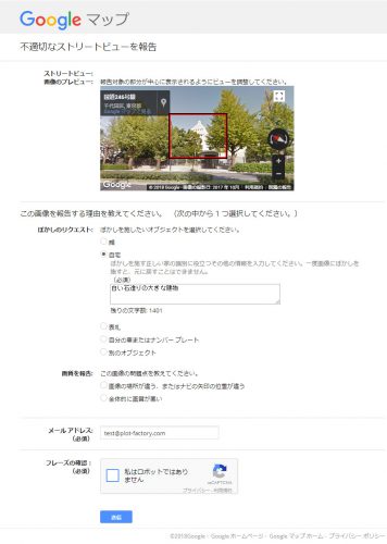 - 自宅の映っているストリートビューの画面を表示させて、右下の「問題の報告」をクリック。